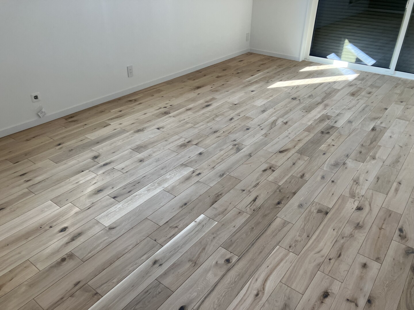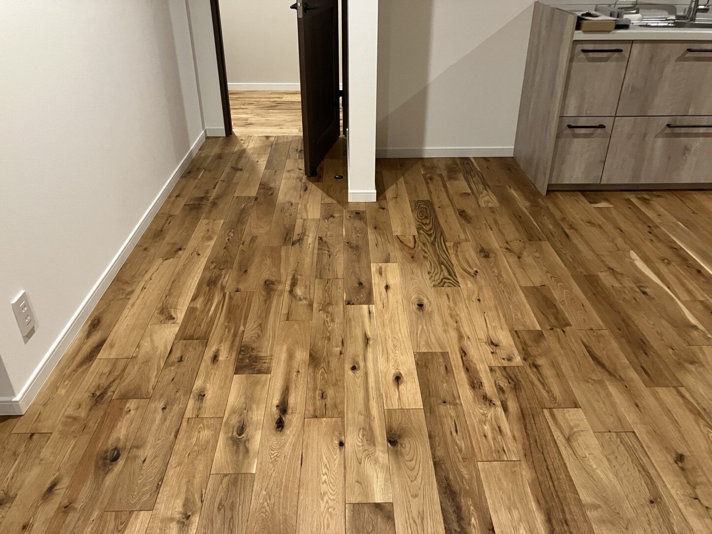 オークの床材をご採用頂きました!今回は無塗装品で納品の上、弊社で塗装仕上げまで承りました。無塗装品では2枚目の写真のような素材感が強いですが、自然オイルで仕上げると3枚目の写真の通り非常に濃厚な色見が出てきます。乱尺なのでより重厚・立体的な張り上りとなりました。グレードも一番人気のラスティックで、無垢材らしい節の表情を楽しめる仕様となっております。スタンダードなユニタイプも人気ですが、乱尺タイプも弊社では在庫しております。お好みに合わせてご提案させて頂きますので、気になる樹種がある方はお気軽にお声かけください。